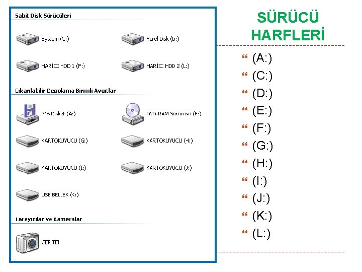 SÜRÜCÜ (Driver) NEDİR? Sürücü (Driver); Dosya ve klasörlerin saklanabileceği ortamlardır ve alfabede bulunan harfler ile (A…Z) temsil edilirler. Disket sürücüler A veya B harfi ile Harddiskler ise C ve sonrasında gelen harfler ile temsil edilirler. CD-SÜRÜCÜ, DVD-SÜRÜCÜ, HARİCİ HARDDİSK, USB BELLEK, KART OKUYUCU vb. diğer aygıtlar ise Harddiskten sonra gelen harfler ile temsil edilirler.