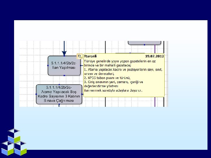 SÜREÇ MODELLEME NEDİR? Kamu hizmet süreçlerinin modellenmesi, kurum içi ve kurum dışı birimlerle etkileşimin ve süreç kapsamındaki rol ve sorumlulukların ortaya konmasını kapsamaktadır. Süreç Modelleme; -İsim, amaç, hedef kitle, sürecin başlama ve bitiş koşulları, girdi ve çıktıları, süreç kapsamındaki roller, aktiviteler ve iş kuralları gibi bilgileri içerecek şekilde kurumların süreç tanımlama sırasında kullanacakları asgari standart alanlar belirlenecektir -Süreçlerin herhangi bir aşamasında kullanılan kurumsal bilgi varlıklarının (sayısal ve sözel verilerin) atomik seviyede analizi, kullanım seviyelerinin belirlenmesi (gizlilik seviyesi, stratejik önemi, paylaşılabilirlik vb. ) ve tanımlanması,