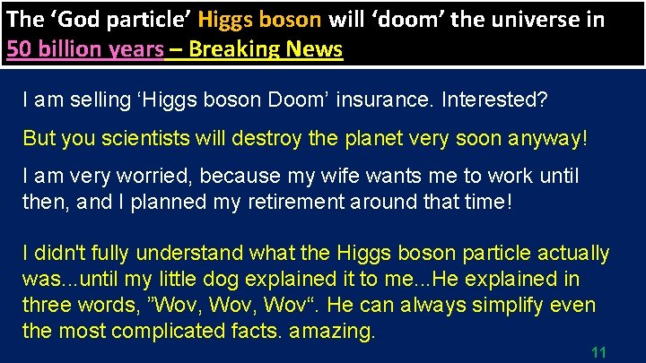 The ‘God particle’ Higgs boson will ‘doom’ the universe in 50 billion years – Breaking News I am selling ‘Higgs boson Doom’ insurance. Interested? But you scientists will destroy the planet very soon anyway! I am very worried, because my wife wants me to work until then, and I planned my retirement around that time! I didn't fully understand what the Higgs boson particle actually was. . . until my little dog explained it to me. . . He explained in three words, ”Wov, Wov“. He can always simplify even the most complicated facts. amazing. 11