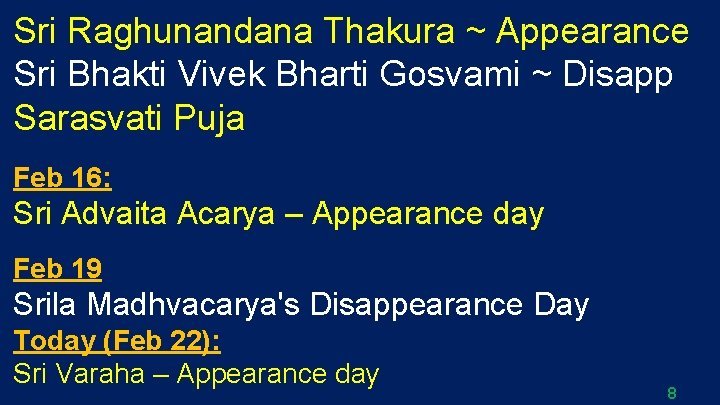 Sri Raghunandana Thakura ~ Appearance Sri Bhakti Vivek Bharti Gosvami ~ Disapp Sarasvati Puja Feb 16: Sri Advaita Acarya – Appearance day Feb 19 Srila Madhvacarya's Disappearance Day Today (Feb 22): Sri Varaha – Appearance day 8