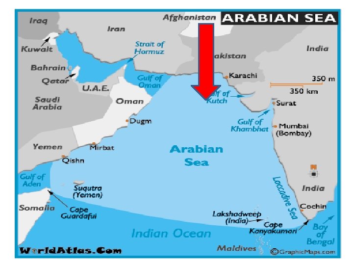 Arabian Sea • An extension of the Indian Ocean, positioned between India, Oman, Pakistan and Yemen, and Cape Guardafui in far northeastern Somalia. • The sea connects with the Persian Gulf through the Gulf of Oman and the Strait of Hormuz. In the southwest, the Gulf of Aden connects it with the Red Sea.