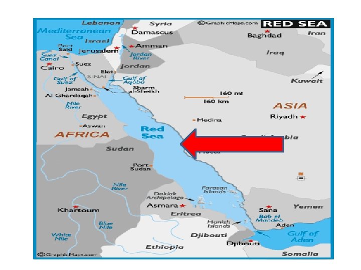 Red Sea • An extension (or inlet) of the Indian Ocean, located between Africa and Asia. • This salty sea is just over 190 miles (300 km) across at its widest point, and about 1, 200 miles (1, 900 km) in length.