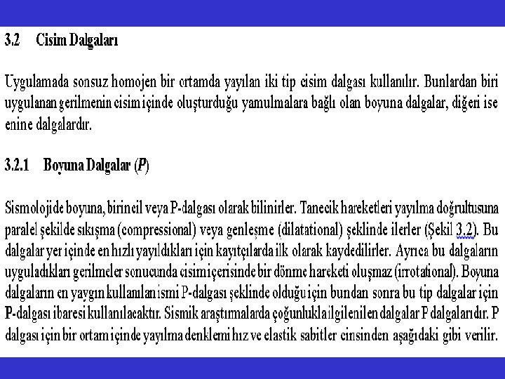 3. SİSMİK DALGALAR 3. 1. Giriş Elastik bir cisme uygulanan gerilme cismin dayanım gücünü aşınca kırılacaktır. Açığa çıkan enerji elastik dalgalar halinde yayılacaktır. Buna göre, sismik dalgalar deprem veya suni bir kaynak gibi sismik kaynaklardan yayılan elastik yamulma enerjisinin parçalarıdırlar. Sismik inceleme için uygun kaynaklar tipik olarak geniş frekans aralıklarını içeren pulslar olarak bilinen kısa süreli dalgaları oluştururlar. Kaynağın hemen yakını hariç, bir sismik pulsun bir kısmı ile ilişkili yamulmalar dakikalarca sürebilir ve bunlar elastik olarak kabul edilebilir. Bu kabule göre, sismik pulsların yayılma hızları, onların içerisinden geçtikleri materyallerin elastik modülleri ve yoğunlukları ile belirlenirler. Sismik dalgaların yer içindeki yayınımlarını elastik teori ile açıklamak için bazı ön kabuller yapılır. Bunlar, • Malzeme (yer içindeki kayaçlar anlamında) içindeki bitişik taneciklerin birbirlerine göre tanecik hareketleri son derece küçüktür, • Malzeme tam elastiktir. Yani gerime ile yamulmalar doğrusal olarak orantılıdır. Yani Hooke’ s yasası geçerlidir, • Malzeme izotroptur. Malzemenin elastik özelliği her doğrultuda aynıdır, • Sürtünme ve yerçekimi gibi dış kuvvetler ihmal edilebilir, şeklinde sıralanabilir.