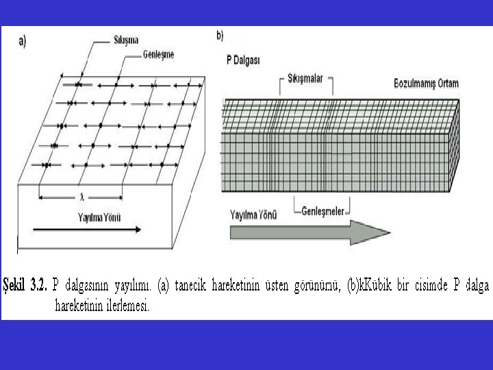 P – Dalgalarının Özellikleri (Özet) • Boyuna , sıkışma ve birincil dalgalar olarak da adlandırılır • Yer içinde en hızlı yayılan dalgalardır. Bu nedenle alıcılarda ilk görülen dalgadır. • Her tür materyal içinde, yani sıvı, gaz, katı içinde yayılabilirler. • Tanecik hareketi yayınım doğrultusundadır • Enerji kaynağından çıkan bir puls elastik ortam içerisinde küresel olarak yayılırken titreşim yapan karaktere sahiptir. • P dalgalarının ürettiği hareket ortam içinde sıkışma ve genleşmelerin değişimi şeklindedir. • Periyodu 1 sn’den az olan dalgalardır. Uzak mesafelere de ulaşabilirler. • P dalgaları aynı zamanda ses dalgalarıdır. Bu nedenle zaman