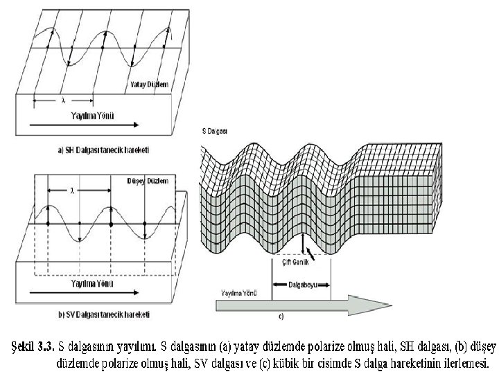 S –Dalgalarının Özellikleri (Özet) • Enine , makaslama ve ikincil dalgalar da denir. • Tanecik hareketi değişen transvers harekettir ve yayılım yönüne diktir. Burada gösterilen transverse hareket düşeydir, fakat her yönde olabilir. Düşey düzlemdeki hareket SV, yatay düzlemdeki SH olarak adlandırılır. • Böyle dalgalara taneciklerin hareket ettiği doğrultuda polarize olmuş dalgalar denir. • İkinci en hızlı yayılan dalgalardır. Bu nedenle kayıtlarda P dalgalarından sonra görülürler. • S dalgaları sadece katı içinde yayılırlar, sıvı ve gaz içinde yayılamazlar. • Deprem kaynağına yakın noktalarda en büyük genlikli dalgalardır ve bu nedenle en fazla hasara neden olan dalgalardır.
