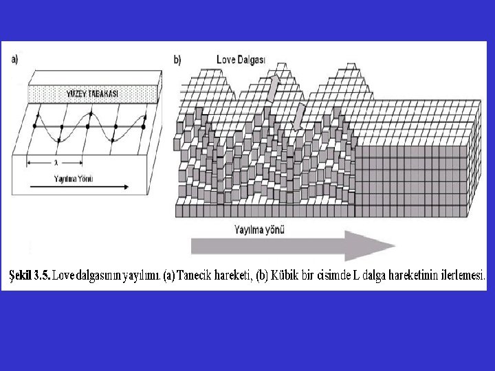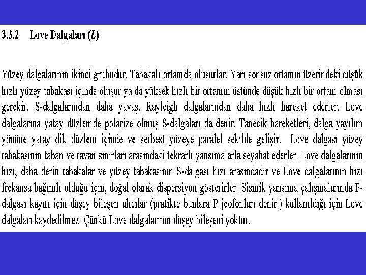 Love Dalgalarının Özellikleri (özet) * En hızlı yayılan yüzey dalgasıdır. Kayıtlarda S dalgalarından sonra Rayleigh dalgalarından önce görülürler. * Bu dalgalar düşük hızlı bir tabakanın üst ve alt yüzeyi arasında ardışık yansımayla yayılmaktadır. * Yerkürenin serbest yüzeyinde oluşurlar. Derinlikle genlikleri azalır. * Love dalgaları yüzeydeki S dalga hızı ile daha derin tabaklardaki hızlar arasında orta mertebede bir hıza sahiptir. * Tanecik hareketi dalga yayılım yönüne dik, enine (transvers) yatay düzlemdedir. * Hareketin yatay düzlemde bileşeni vardır. Düşey bileşeni yoktur. Bu nedenle sadece yatay bileşen sismogramlarda görülürler. Bu yüzden P jeofonları tarafından kaydedilemezler.