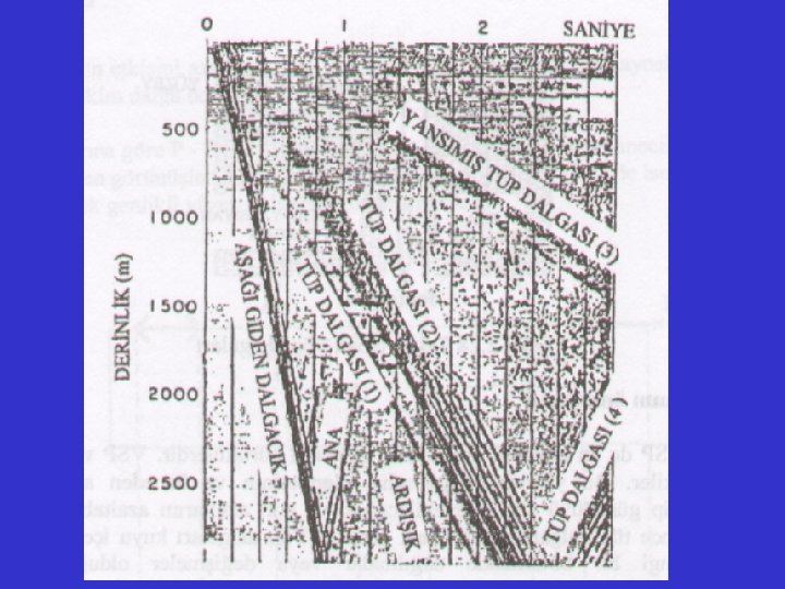 KANAL (TÜP) DALGALARININ KAYNAKLARI • Bir VSP kesitinde yayılmış tüp dalga modlarının zaman ve derinlik olarak yerlerinin belirlenmesiyle bu dalga modlarını oluşturan nedenler açıklanabilir. Örneğin aşağıdaki şekilde vibratörler kullanılarak kaydedilmiş bir veride 4 tip dalga modu tanımlanmıştır. Mevcut veriye AGC (otomatik kazanç kontrolü) uygulanmıştır. • Tüp dalgası 1: Bunun nedeni P dalgasının çamur kolonu içerisinde yayılırken bir karışıklığa neden olmasıdır. Böylelikle kuyu içinde büyük bir empedans değişimiyle tüp dalgaları yaratılır. • Tüp dalgası 2: En güçlüsüdür. Üç ve dördüncü modlar bu ikinci modu yaratır. Jeofon yüzeyde iken ilk varışlar Rayleigh dalgalarıdır. Mod birde ise bunlar sıışma dalgalarıdır. • Tüp dalgası 3: Kuyu içerisindeki jeofonun üstü ile yüzey arasında mod ikinin tekrarlanmasıdır. Mod üç, mod bir ve mod ikinin 1/3 hızı ile aşağı hareket eder. Çünkü bu mod üç defa seyahat etmiş ve daha önce kaydedilmiştir. • Tüp dalgası 4: mod ikinin VSP kuyusunun altındaki tabakadan yansımasıyla oluşmuştur. Not: Mod 2 sönümlenebilirse mod 3 ve 4 ortaya çıkmaz.