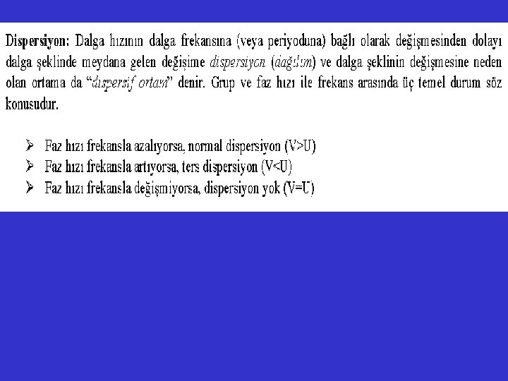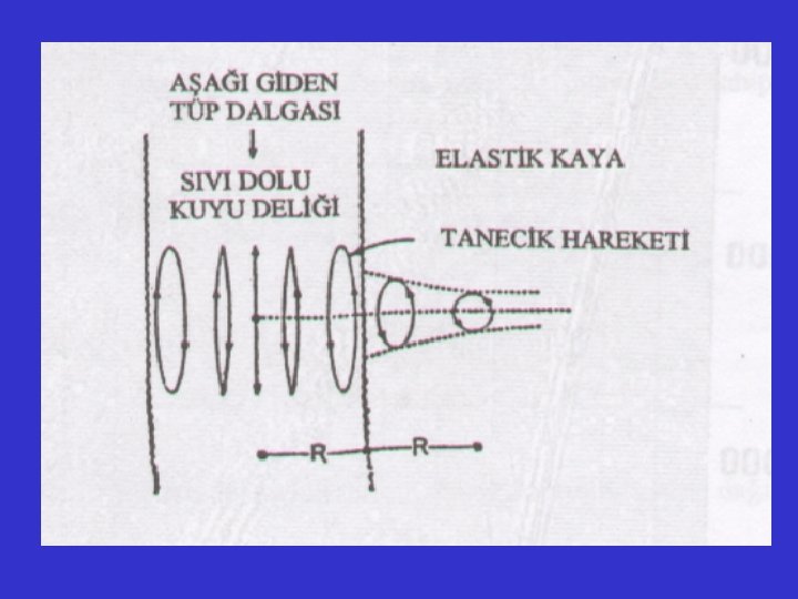 Kanal (Tüp) Dalgalarının Özellikleri • Tüp dalgaları kuyunun çapına, duvarına , kuyu boşluklarının doldurulmasına bağlı olarak büyük değişiklikler göstermektedir. • Göreceli olarak yüksek genlikli ve düşük frekanslı yönlendirilmiş dalgalar olup çok az dispersif özellik gösterirler. • Genlikleri kuyu sıvı sınırından uzaklaştıkça bozulur. Bu da tüp dalgalarının faz hızlarının formasyon ve sıvı hızlarından az olacağını gösterir. • Tüp dalgaları sıvı dolu kuyunun düşey ekseni boyunca odaklandığından yönelmiş dalgalardır. Sadece çok az bir miktarı formasyon içine sızar. • Tüp dalgalarının genlikleri gidiş geliş mesafesiyle azalmaz. Ve bu dalgalar kuyu içinde küresel olarak genişlemez. Şekilde tüp dalgası yayılımının tanecik hareketinin sıvı içerisindeki tanecik hareketinden daha az olduğu görülmektedir. • Dalgaların genliği jeofonu kuyu cidarına yerleştiren kuvvet ve kuyu içindeki sıvının yoğunluğu ile ters orantılıdır. Kuyuda ağır çamur varsa tüp dalgası daha çabuk sönümlenecektir.