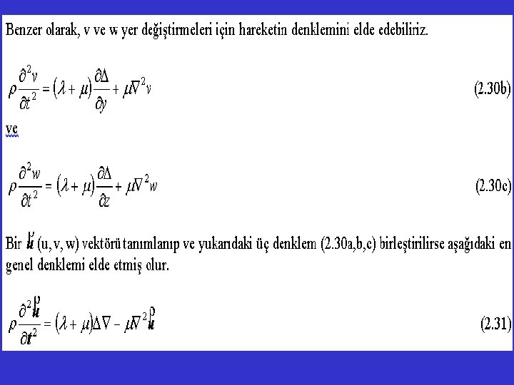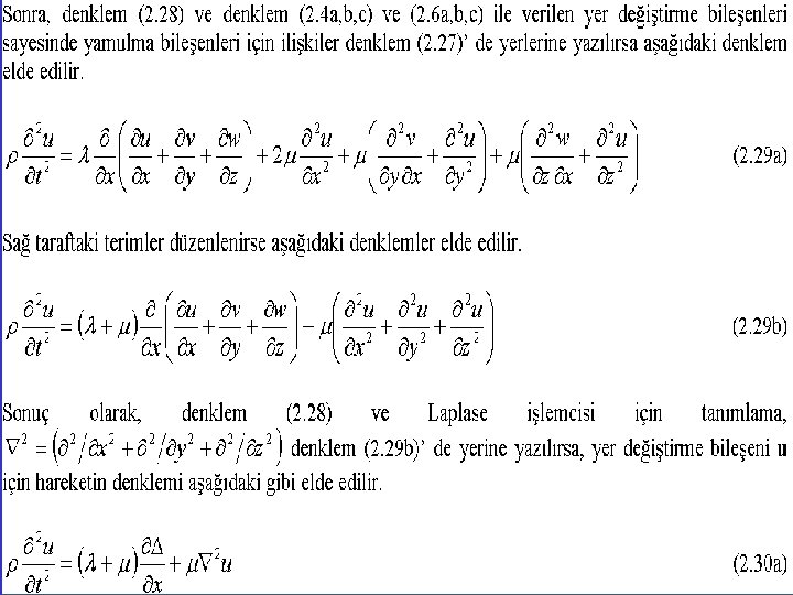 2. 3 Elastik Dalga Denklemi Şimdi hareket denklemini gözden geçirelim ve gerilme alanlarının elastik bir katı içinde nasıl yayıldığını inceleyelim. Aşağıdaki şekilde küçük yer değiştirmeler ve hızlar için ve yer çekimi (gravite) gibi uygulama noktası etrafında cisim üzerine etkiyen cisim kuvvetlerini (yüzey normali doğrultusundaki) ihmal edersek, Newton’s un ikinci yasası yer değiştirme bileşeni ‘u’ için hareketin denklemini verir. Burada, ‘ ’ yoğunluktur.