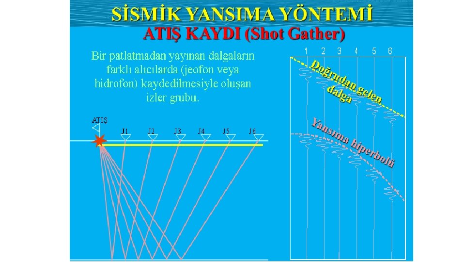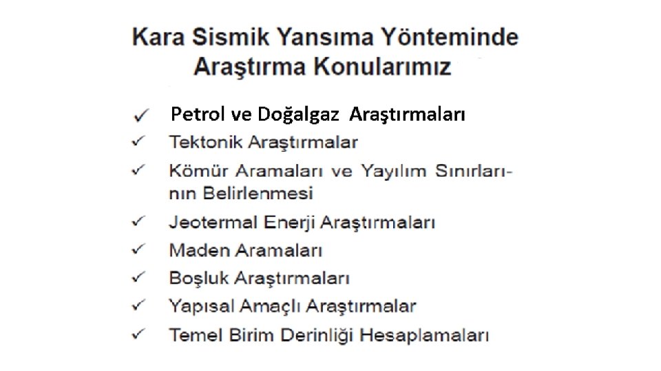 Sismik Yansıma • Çok yaygın bir tekniktir. • Petrol aramacılığı, • Kara ve denizde, • 10 m ‘den kabuk ve manto derinlikleri gibi farklı derinliklerden bilgi alınabilir. AMAÇLAR • Tabaka ara yüzeylerinden yansıma geometrisi ve sismik dalga enerjisi • Yapı ve stratigrafi • Kaya ve sedimanların fiziksel özellikleri • Sismik Hız