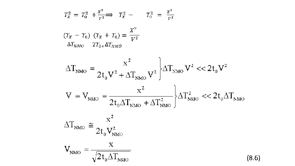 NMO düzeltmesi aşağıdaki gibi verilir. (8. 5) Bu denklemler NMO uygulaması için çok önemlidir. Derinliğin ofsetten (z>>x) çok büyük olduğu durumlarda NMO düzeltmesinde kullanılır. Bu nedenle, NMO hızı kısa açılımlardaki hiperbolik yansımalar için geçerlidir. Bu ilişkiler, denklem (8. 2)’ye Binom açılımı uygulanır ve yüksek terimler ihmal edildiğinde de elde edilebilir. Şekil 8. 5, denklem (8. 2) ve denklem (8. 6) arasındaki uyumun açılıma göre değişimini göstermektedir.