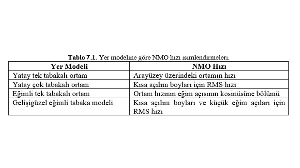Denklem (7. 6)’daki VNMO hızı, NMO etkisini gidermek için kullanılan hız olup, ortak derinlik noktası (ODN) yansıma izlerinin birleştirilmesi (farklı kaynaktan ve farklı derinliklerde aynı noktadan yansıyan izler arasındaki NMO etkisi giderilen izler üste toplanır) için kullanılan yığma hızı olarak da bilinir. Yorum açısından çok önem arz etmeyen bu hız bilgisi daha ziyade işlem aşamasında kullanılır. NMO hızı kaynak ve alıcılar arası mesafelerden ve yeraltındaki eğimli yansıtıcı yüzeylerden etkilendiğinden bazen yanıltıcı ara hız değerlerine neden olur. Tablo 7. 1’de yer modeline göre NMO hızının anlamları verilmektedir. Görüldüğü üzere, NMO hızı kısa açılımlardaki hiperbolik yansımalar için geçerli iken, yığma hızı tüm açılım boyunca en uyumu sağlar. RMS hızı tabakalı ortamda NMO düzeltmesi için kullanılmaktadır.