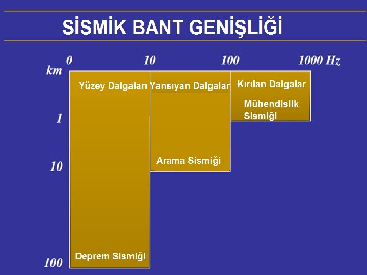 • (a) Mühendislik çalışmaları ve 1 km’ lik derinlik içerisinde yer alan kömür, yeraltı suyu, jeotermal araştırmaları ve yakın yüzey jeolojisinin açıklanması: Yakın yüzey (sığ sismik) çalışmaları için uygulanan sismik yöntem Mühendislik Sismolojisi olarak bilinir. İlgilen frekans aralığı 0 -1000 Hz arasındadır. • (b) 10 km’ lik derinlik içinde hidrokarbon araştırma ve gelişimi: Petrol ve gaz alanlarının araştırılması ve gelişimi için uygulanan sismik yöntem Araştırma Sismolojisi olarak bilinir. İlgilen frekans aralığı kara sismiğinde 0 -100 Hz ve deniz sismiğinde 0 -250 Hz arasındadır. • (c) 100 km derinlik içindeki yer kabuğu yapısının incelenmesi: Kabuk ve deprem çalışmaları için uygulanan sismik yöntem Deprem sismolojisi olarak bilinir. İlgilen frekans aralığı 0 -10 Hz arasındadır.