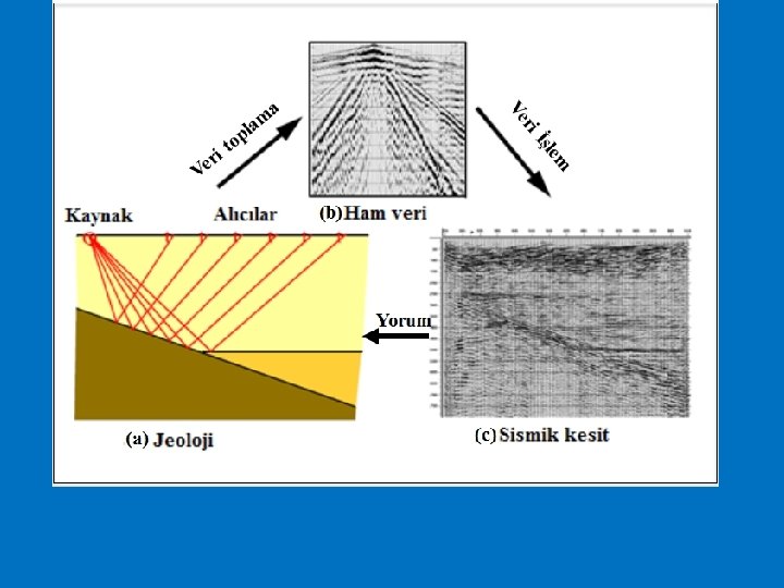 BAŞLICA AŞAMALAR • Veri Toplama (Data Acquisition and Quality Control in 2 D & 3 D, land & marine) - Kaynak sistemleri - Alıcı sistemleri - Kayıt sistemleri - Navigasyon sistemleri • Veri işleme (Data Processing) - Yüksek hızlı okuma-yazma, veri işleme, depolama kabiliyetli bilgisayarlar - Grafik arayüzü gelişmiş uygulama yazılımları. • Veri Yorumlama (Data Interpretation, Qualitative & Quantitative) - Jeolojik bilgi - Grafik arayüzü gelişmiş uygulama/modelleme yazılımları