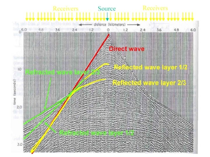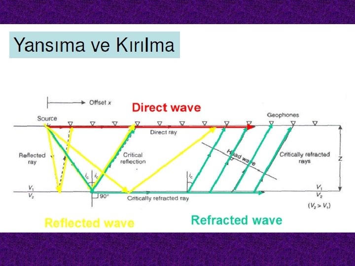 Sismiğin Temel Yöntemlerinin Kıyaslanması SİSMİK KIRILMA SİSMİK YANSIMA - Hız kontrastı( farklılaşması) esastır. - Kabuk araştırmaları ve mühendislik - - Hız ve yoğunluk kontrastı esastır. Petrol, doğal gaz ve jeotermal jeofiziğinde kullanılır (tabaka kalınlıkları aramalarında ve görüntülenmesinde ve P ve S dalga hızları ve bunlardan kullanılır (genel olarak). Bunun dışında elastik parametrelerin hesabı). mühendislik uygulamalarında, stratigrafik incelemede ve iklim değişimlerinin araştırılmasında kullanılmaktadır. - Alçak frekanslı kaynak gerektirir ( ≈ 10 Hz) frekans bandı). - Yüksek frekanslı kaynak gerektirir. (0 -10. 000 Hz; hatta sığ çalışmalarda 40. 000 Hz). - Daha az sayıda alıcı kullanılır. - Veri işlem adımları azdır yada hiç yoktur. - Daha çok sayıda alıcı (kanal) kullanılır. - Çok sayıda veri işlem adımı gerektirir.