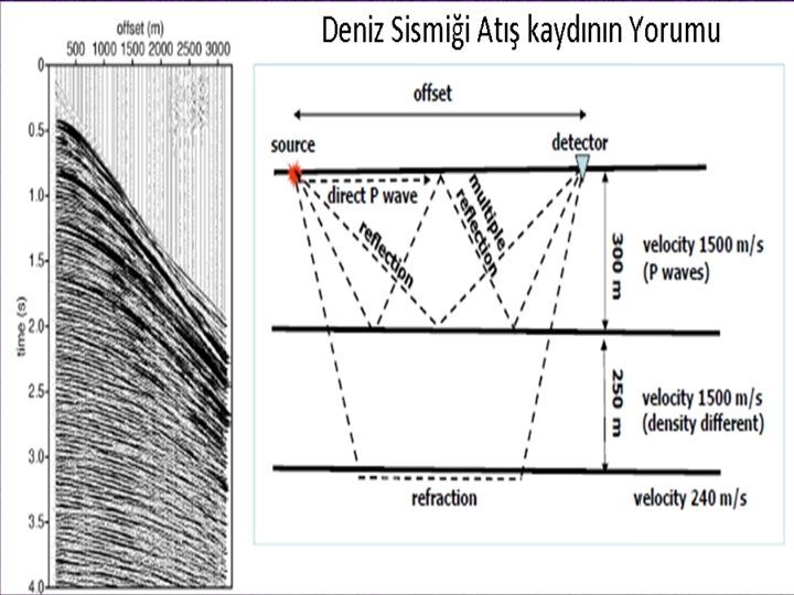 TEMEL İLKELER – KAYNAK TÜRÜ Sismik Yansıma Yöntemi Uygulaması için: - Sismik dalga üreten bir kaynak (airgun, vibratör vb. ) - Sismik dalga algılayan bir veya çok sayıda alıcı (hidrofon veya jeofon) - Algılanan sismik sinyalleri kayıt eden bir cihaz (sayısal sismograf) Sismik yansıma yönteminde kullanılan dalga türü: - Başlıca dalga türü P-dalgaları (Primary waves) - Kara operasyonlarında, bazı çalışmalarda S-dalgaları (Secondary waves) Gürültü kaynakları (Noise): - Dalga yayınımı nedeniyle olanlar (yüzey dalgaları, tekrarlı yansımalar, deniz tabanı tekrarlı yansımaları, hayalet yansımalar (ghost reflections) - Ortam kaynaklı gürültüler (rüzgar, dalga, ) - Çevresel gürültüler (motorlu araçlar, sesli çalışan her türlü makina, dümen suyu vb. )