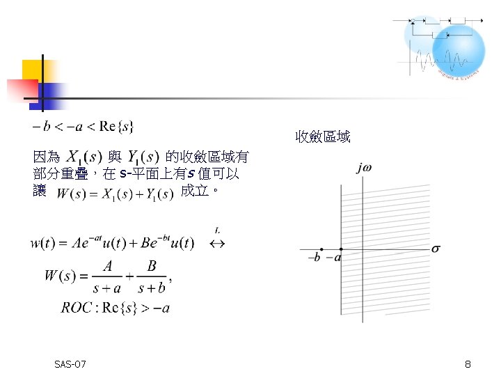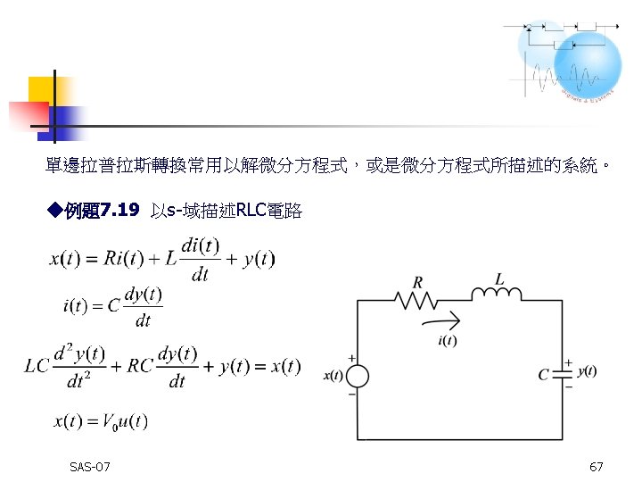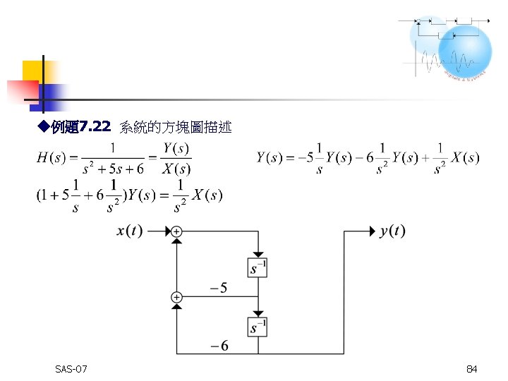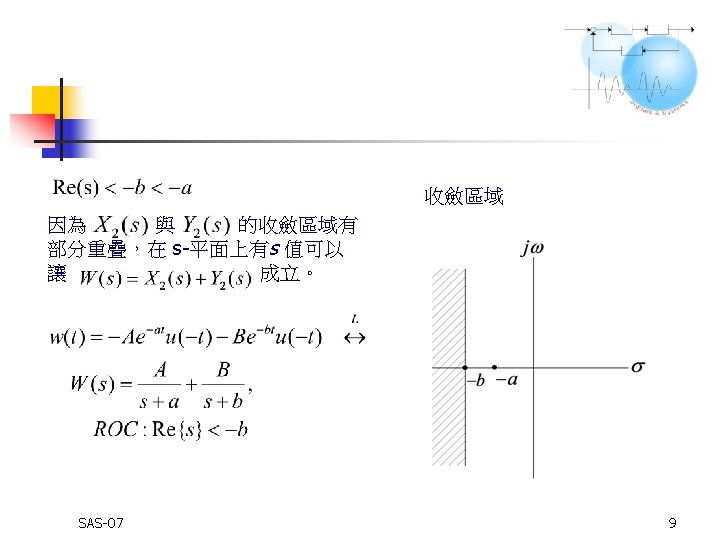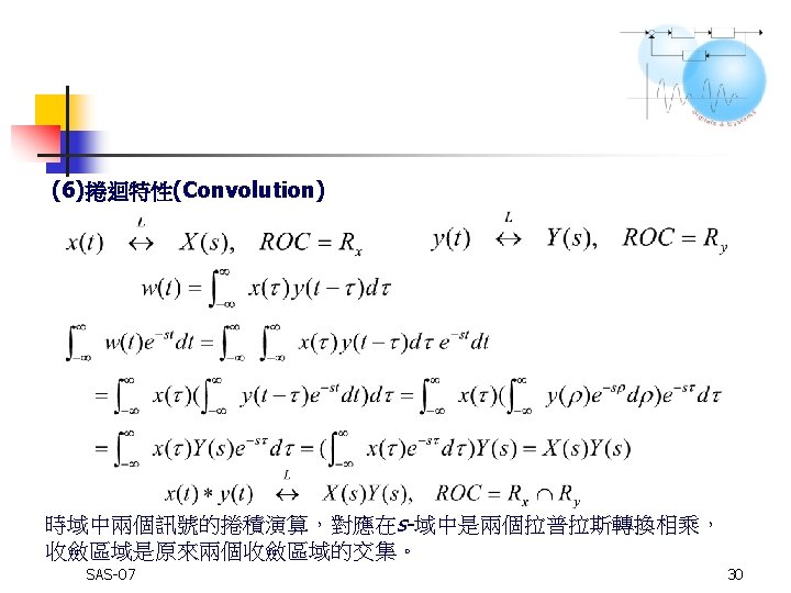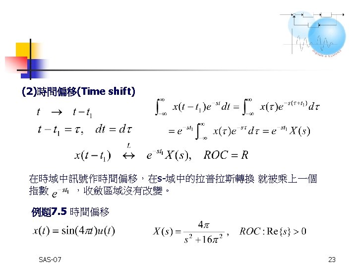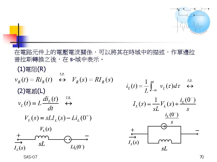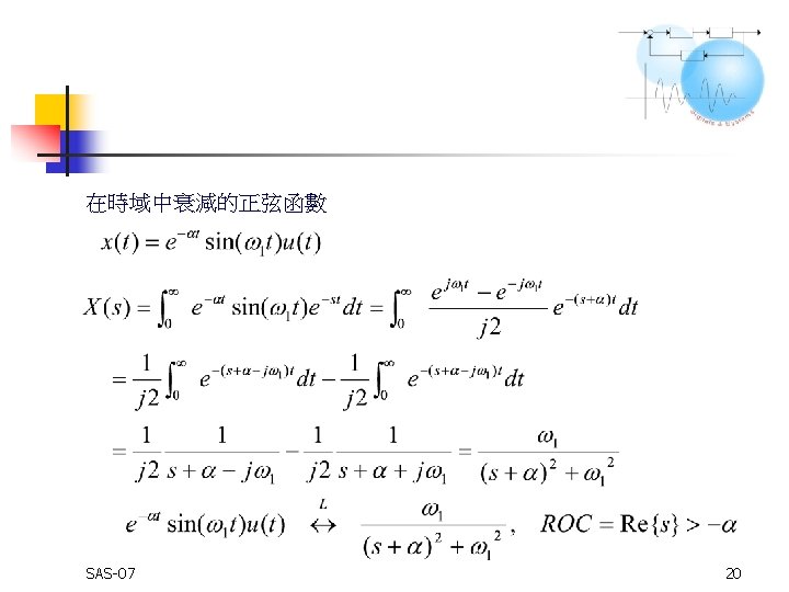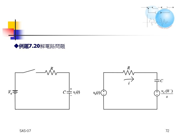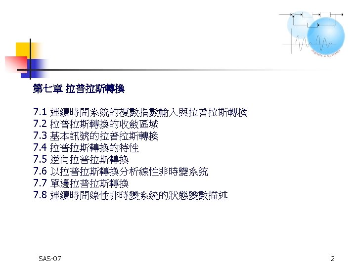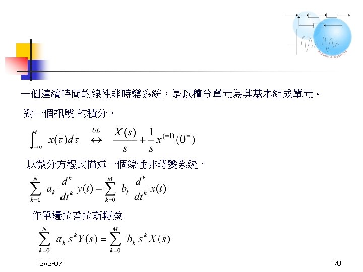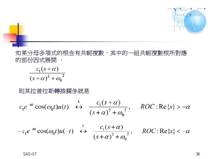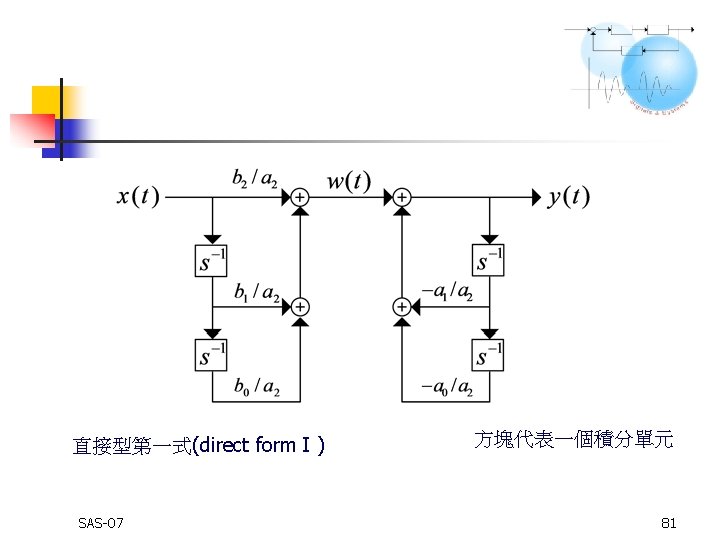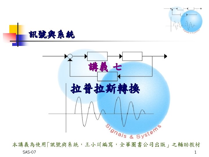 ssplane inverse Laplace transform SAS07 4 Region of Slides: 91 Download presentation s-平面(s-plane) 逆向拉普拉斯轉換(inverse Laplace transform) SAS-07 4 收斂區域(Region of convergence), ROC 例題7. 1 兩個極點的 函數收斂區域 SAS-07 7 7. 3 基本訊號的拉普拉斯轉換 (1)脈衝函數(Impulse function) SAS-07 (2)步進函數(Step function) 12 (3)逆向時間的步進函數 (Reversed step function) SAS-07 (4)指數函數(Exponential signal) 13 (5)逆向時間的指數函數(Reversed exponential signal) SAS-07 14 (6)弦波訊號(Sinewaves) 餘弦函數 SAS-07 16 SAS-07 28 (5)共軛特性(Conjugation) SAS-07 29 (7)對時間的微分 (Differentiation in time) SAS-07 (8) s- 域的微分 (Differentiation in s-domain) 31 (9)對時間的積分(Integration in time) SAS-07 32 SAS-07 35 SAS-07 43 SAS-07 44 SAS-07 45 SAS-07 47 SAS-07 48 SAS-07 49 (1)線性特性(Linearity) SAS-07 51 (2)時間偏移(Time shifting) 例題7. 12 時間偏移 SAS-07 52 SAS-07 53 (3) s-域偏移(Shifting in sdomain) SAS-07 例題7. 13 s-域偏移 54 (4)時間的比例調整(Time scaling) SAS-07 55 (5)捲迴特性(Convolution) SAS-07 56 SAS-07 58 (6)對時間的微分(Differentiation in time) SAS-07 59 (7) s-域微分 (Differentiation in s-domain) SAS-07 61 (8)對時間的積分(Integration in time) SAS-07 63 (9)初始值原理與終值原理(Initial value theorem and Final value theorem) SAS-07 65 例題7. 18 計算訊號的初始值 初始值原理(initial value theorem) 終值原理(final value theorem) SAS-07 66 SAS-07 68 解得 SAS-07 69 (3)電容(C) SAS-07 71 SAS-07 73 SAS-07 75 SAS-07 77 SAS-07 82 直接型第二式(direct form II ) SAS-07 83 SAS-07 85 SAS-07 86 SAS-07 87 SAS-07 88 SAS-07 90 狀態向量(state vector) 狀態方程式(state equation) 輸出方程式(output equation) SAS-07 91