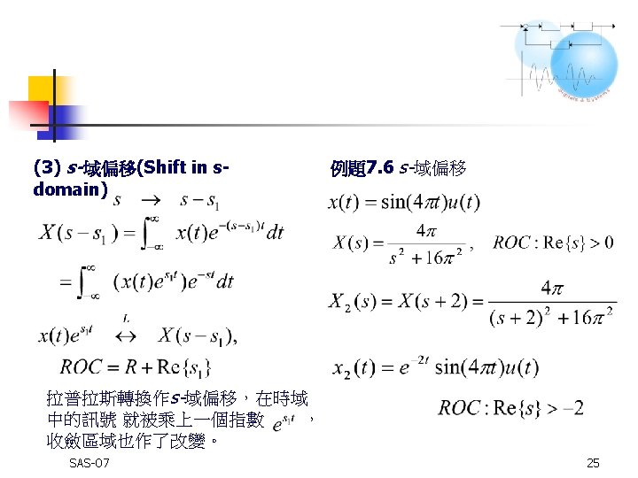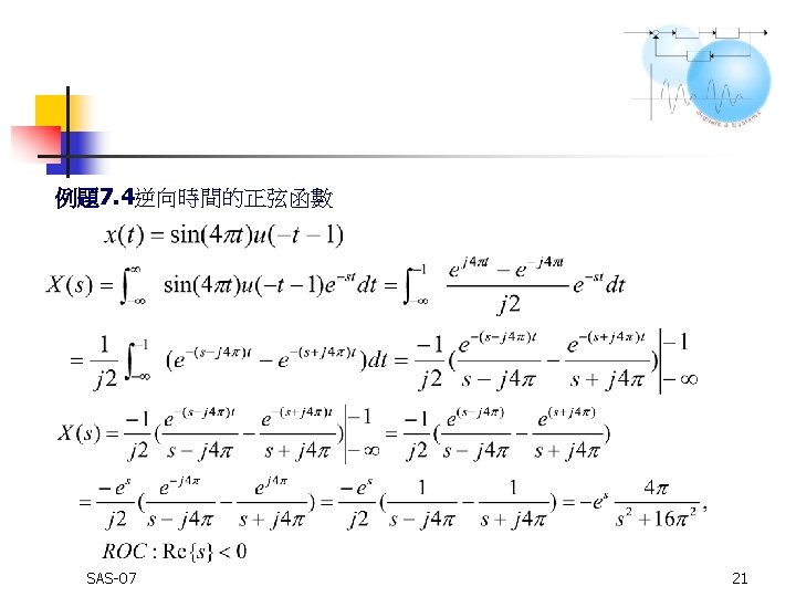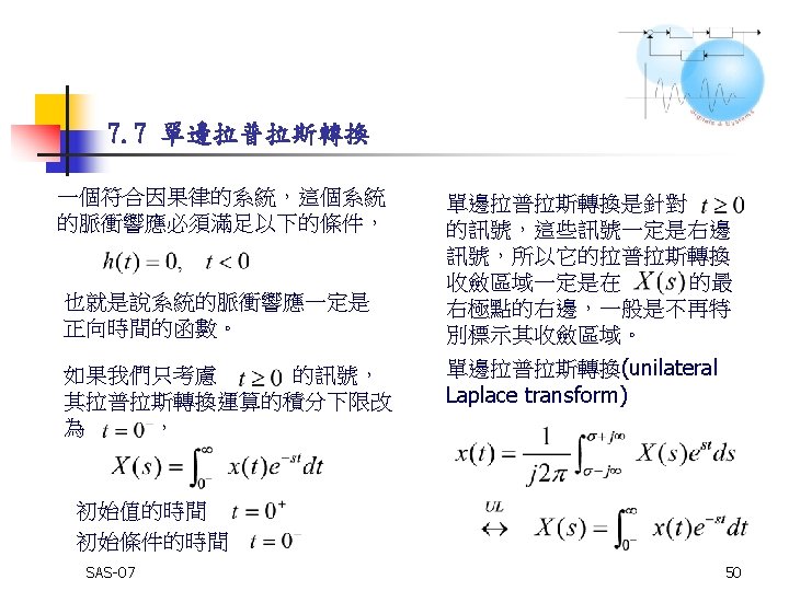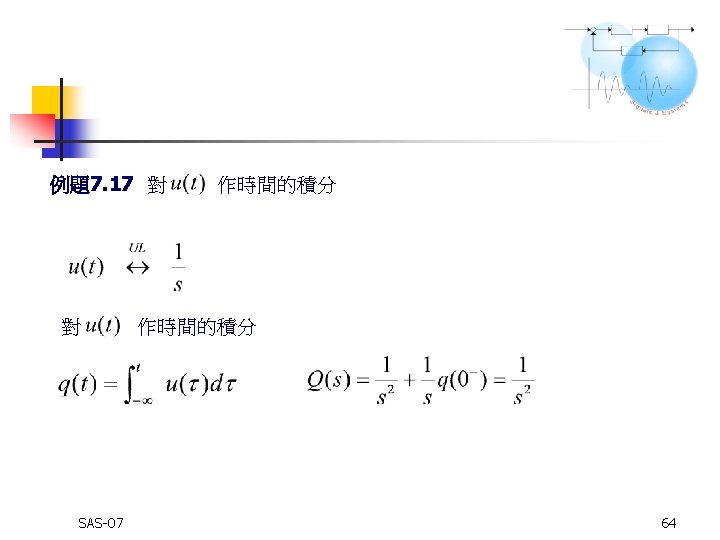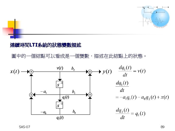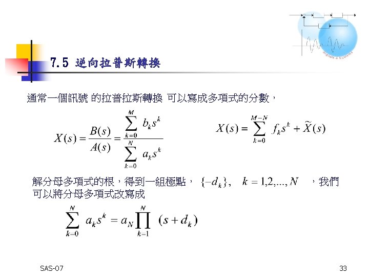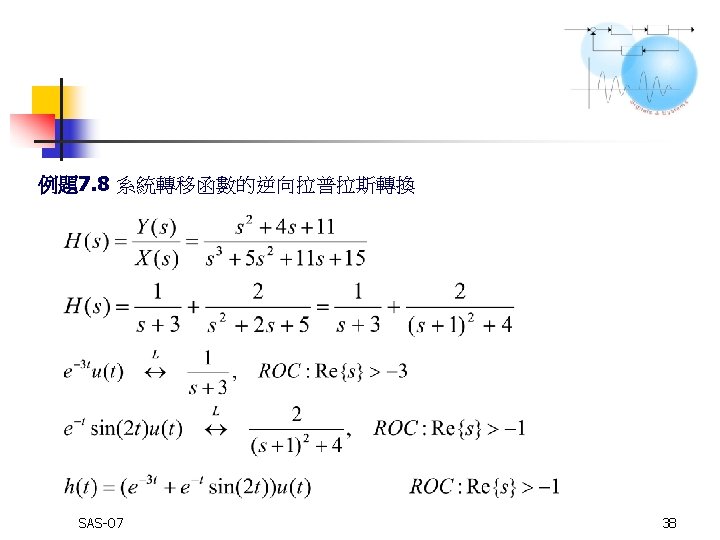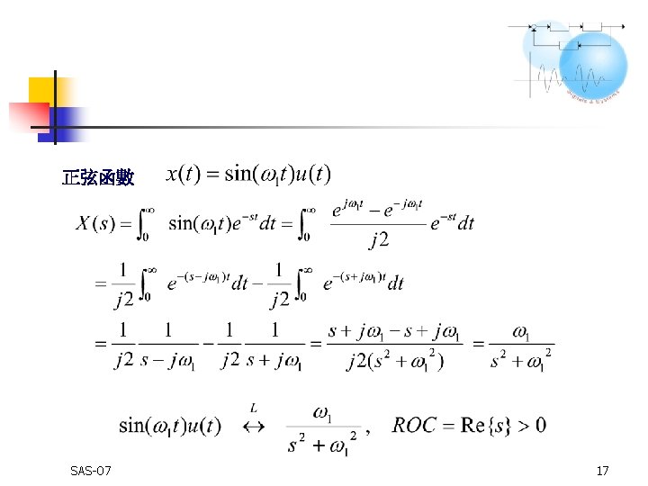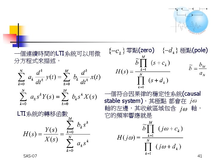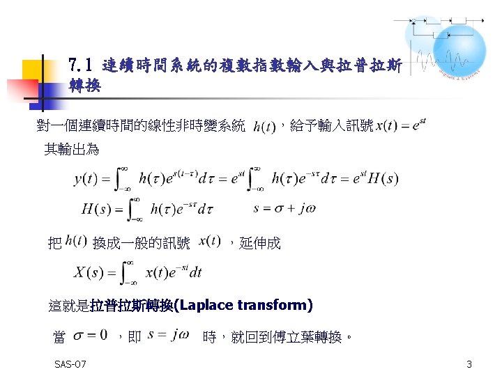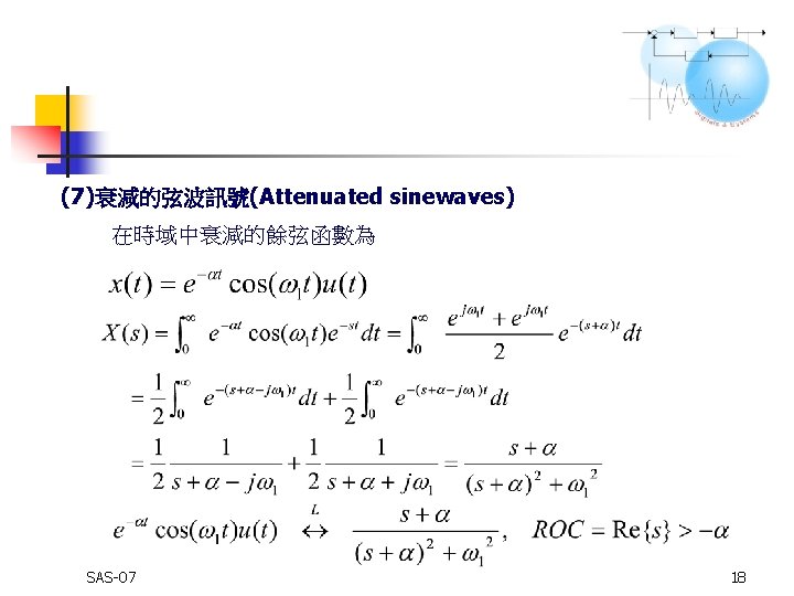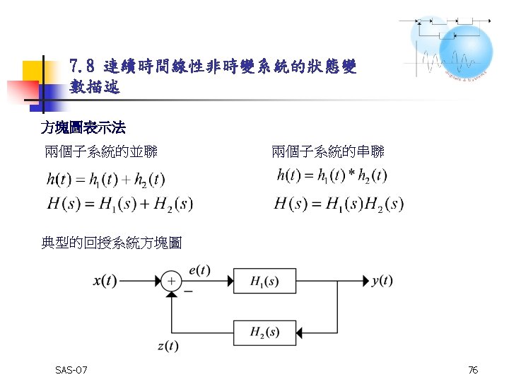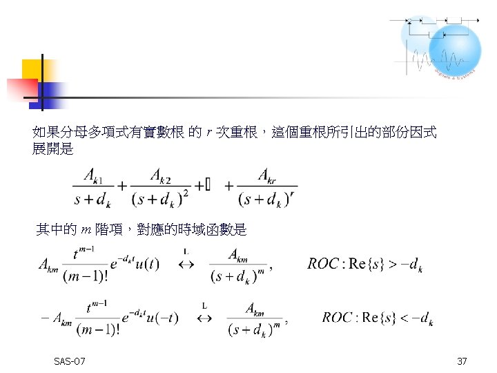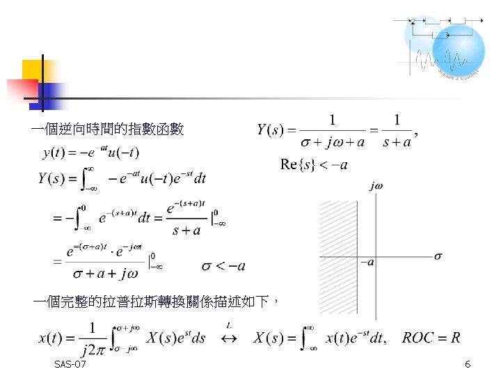 ssplane inverse Laplace transform SAS07 4 Region of Slides: 91 Download presentation s-平面(s-plane) 逆向拉普拉斯轉換(inverse Laplace transform) SAS-07 4 收斂區域(Region of convergence), ROC 例題7. 1 兩個極點的 函數收斂區域 SAS-07 7 7. 3 基本訊號的拉普拉斯轉換 (1)脈衝函數(Impulse function) SAS-07 (2)步進函數(Step function) 12 (3)逆向時間的步進函數 (Reversed step function) SAS-07 (4)指數函數(Exponential signal) 13 (5)逆向時間的指數函數(Reversed exponential signal) SAS-07 14 (6)弦波訊號(Sinewaves) 餘弦函數 SAS-07 16 SAS-07 28 (5)共軛特性(Conjugation) SAS-07 29 (7)對時間的微分 (Differentiation in time) SAS-07 (8) s- 域的微分 (Differentiation in s-domain) 31 (9)對時間的積分(Integration in time) SAS-07 32 SAS-07 35 SAS-07 43 SAS-07 44 SAS-07 45 SAS-07 47 SAS-07 48 SAS-07 49 (1)線性特性(Linearity) SAS-07 51 (2)時間偏移(Time shifting) 例題7. 12 時間偏移 SAS-07 52 SAS-07 53 (3) s-域偏移(Shifting in sdomain) SAS-07 例題7. 13 s-域偏移 54 (4)時間的比例調整(Time scaling) SAS-07 55 (5)捲迴特性(Convolution) SAS-07 56 SAS-07 58 (6)對時間的微分(Differentiation in time) SAS-07 59 (7) s-域微分 (Differentiation in s-domain) SAS-07 61 (8)對時間的積分(Integration in time) SAS-07 63 (9)初始值原理與終值原理(Initial value theorem and Final value theorem) SAS-07 65 例題7. 18 計算訊號的初始值 初始值原理(initial value theorem) 終值原理(final value theorem) SAS-07 66 SAS-07 68 解得 SAS-07 69 (3)電容(C) SAS-07 71 SAS-07 73 SAS-07 75 SAS-07 77 SAS-07 82 直接型第二式(direct form II ) SAS-07 83 SAS-07 85 SAS-07 86 SAS-07 87 SAS-07 88 SAS-07 90 狀態向量(state vector) 狀態方程式(state equation) 輸出方程式(output equation) SAS-07 91