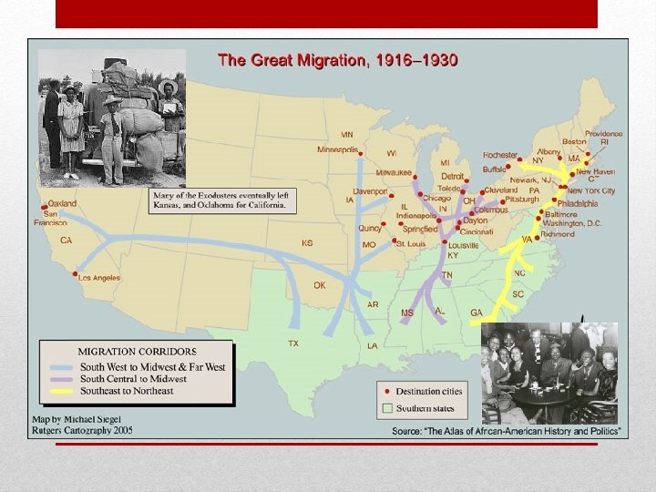 Great Migration • Northern factories needed workers during the war for two main reasons: -Many white workers joined the war effort or were drafted. -Nearly all immigration from Europe stopped. To replace these workers, thousands of African Americans left the South and moved into Northern cities looking for factory jobs. This movement became known as the Great Migration.