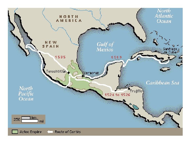Hernan Cortes • In 1519, Cortes landed on the coast of Mexico, drawn by rumors of a land filled with gold. His 600 -man expedition marched into the interior and encountered the vast Aztec empire, which indeed was rich with gold. • Cortes later seized power from the Aztec rulers and claimed the land, people, and Aztec riches for Spain. Cortes’ exploits inspired a generation of Spanish explorations in search of another interior empire to conquer.