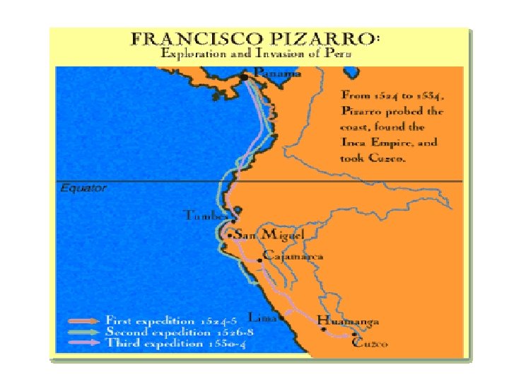 Francisco Pizarro • The only other Spanish conquistador to come close to matching the richness of the Cortes expedition was Francisco Pizarro explored the western coast of South America in 1532, eventually finding the Inca Empire and conquering its capital, Cuzco, in a scenario remarkably similar to Cortes. • The Inca proved equally rich in gold and silver as well, bringing unheard of wealth to Spain, who now had established a Spanish Empire across much of Mexico, along with large portions of Central and South America.
