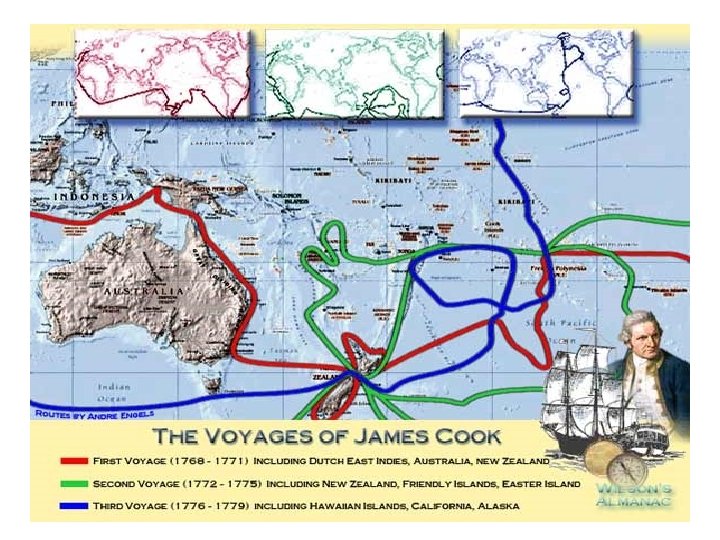 James Cook • James Cook was a British sea captain who explored the South Pacific, Hawaii, much of Polynesia, and the northwest coast of America. Cook claimed New Zealand parts of Australia for Great Britain in 1769 -70. • These regions represented one of the last large unclaimed (by European powers) areas of the world. Cook’s voyages are generally recognized as one of the last frontiers in the age of exploration.