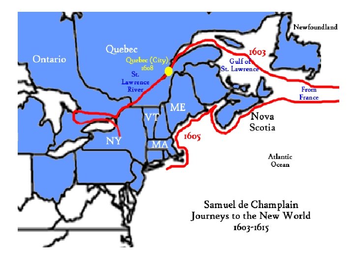 Samuel de Champlain • More a century after the Spanish had established colonies in the Americas, other European nations began to establish a presence in America. Most were initially searching for the “north-west passage” through the Americas, to the riches of the Asian trade, but ended up claiming lands and establishing colonies. • The French had already explored the St. Lawrence River, but in 1608 Samuel de Champlain founded the colony of Quebec, New France. From their base in Quebec, the French spread southward, eventually making a claim for France on the entire Great Lakes and Mississippi River Valley region. • Around the same time, in 1607, the English established their first permanent colony in North America. Eventually the English and French would clash over North America- in the 1763 French and Indian War, whereby the French were defeated and divested of their North American empire.