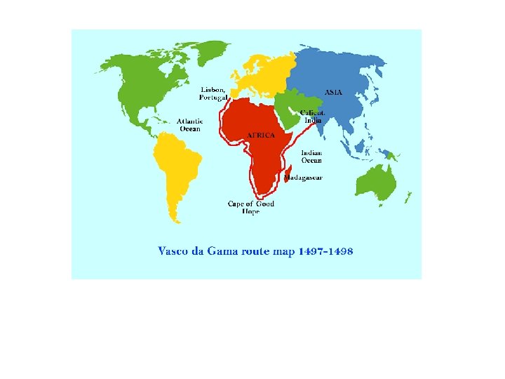 Vasco da Gama • From the time of the Crusades, markets for eastern goodssugar, salt, spices, silk, as well as ivory, precious metals and jewels- began to grow in Europe. As Europeans ventured farther from home to trade and explore, a primary goal became to establish a sea route to the east, to cut off the Muslim and Italian merchants who ruled the overland flow of eastern goods to Europe. • Sailing for Portugal, Vasco da Gama was the first European to establish a sea route to India, when he landed at Calicut in 1498. Da Gama returned to Europe with exotic cargo, worth 60 times the cost of the voyage. • Portugal soon established a trading empire in the Indian Ocean, effectively wresting the lucrative spice trade from the Muslims.