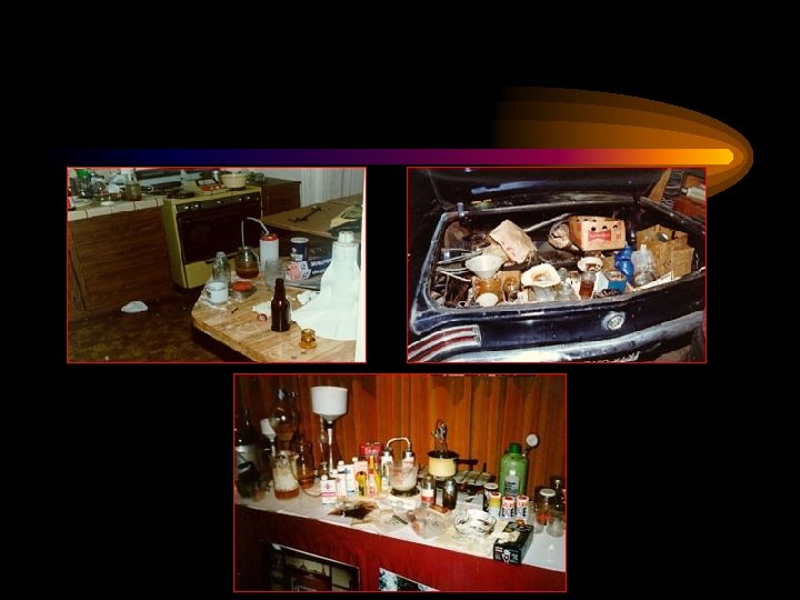 Meth Labs • Clandestine labs – are found in rural and city settings; barns, garages, apartments, hotel rooms and vehicles. • Meth labs are very, very dangerous. They expose you to chemical contamination and are highly flammable and explosive. • Some warning signs that a dangerous Meth lab may be in your neighborhood: unusual odors (cat urine or ammonia smell), high traffic to the house, and excessive trash.