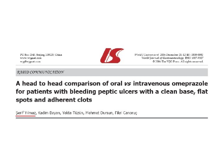 n n n n IV PPI protokolu (80 mg IV puşe, 8 mg/h infüzyon 72 saat) IV vs. PO H 2 RA’lerinden etkili H 2 RA’leri önerilmemektedir Somatostatin ve Octreotide önerilmemektedir. Gebelikte PPI kategori B Erken H. pylori test ve tedavisi Beslenme. . (düşük risk-ilk 24 saatte+)