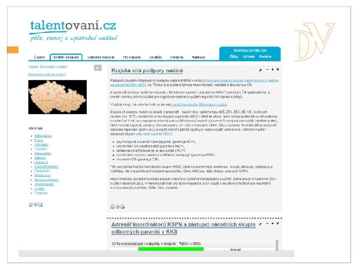 Krajské sítě podpory nadání Krajská koordinační skupina • krajský koordinátor SPN (NIDV) • psychologové a speciální pedagogové (garantuje NUV) • koordinátoři pro oblast soutěží (garantuje NIDV ve spolupráci s KÚ) • pedagogové (garantuje NUV) • inspektoři ČŠI (garantuje ČŠI) Krajská síť podpory nadání • MŠ, ZŠ, SŠ, VŠ • SVČ, NNO • Zaměstnavatelé • Odborná pracoviště (věda, průmysl…) • Jiné organizace a sítě Nadregionální síť SIPON