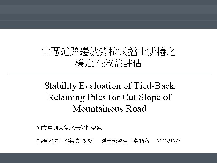 山區道路邊坡背拉式擋土排樁之穩定性效益評估 Stability Evaluation of Tied-Back Retaining Piles for Cut Slope of Mountainous Road 前言 文獻回顧 研究區域概況 研究方法 結果與討論 1