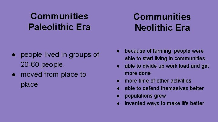 Communities Paleolithic Era ● people lived in groups of 20 -60 people. ● moved from place to place Communities Neolithic Era ● because of farming, people were able to start living in communities. ● able to divide up work load and get more done ● more time of other activities ● able to defend themselves better ● populations grew ● invented ways to make life better