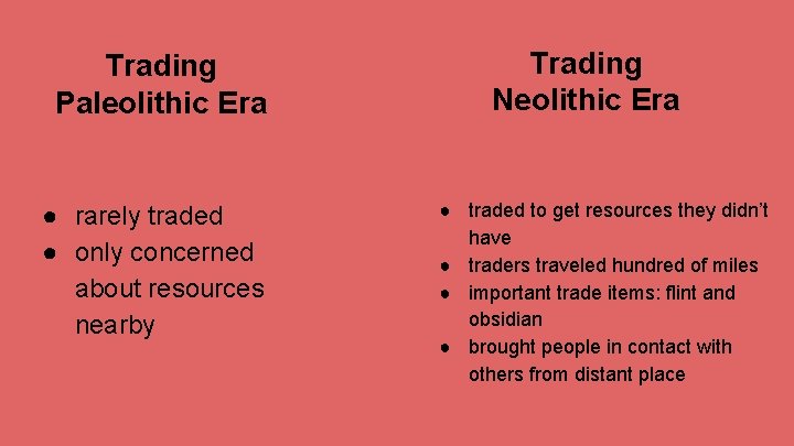 Trading Paleolithic Era ● rarely traded ● only concerned about resources nearby Trading Neolithic Era ● traded to get resources they didn’t have ● traders traveled hundred of miles ● important trade items: flint and obsidian ● brought people in contact with others from distant place