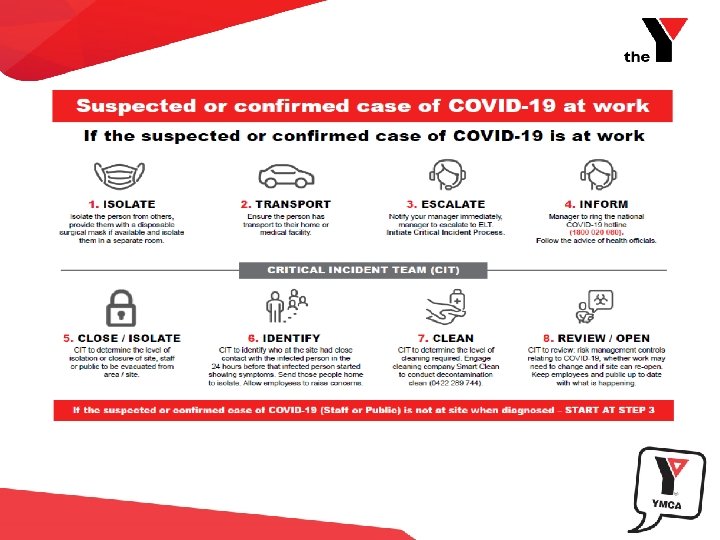 COVIDSafe Commitments 4. Increased hygiene and cleaning. Where required all staff, visitors and patrons will wear a mask within Y facilities. There will be hand sanitiser available at entry and exit points, as well as in high touch point areas and areas of high traffic. All sites will increase cleaning, with regular touch point cleans and 24 -hour facility cleans. 5. Training for staff. All staff will need to complete the Department of Health COVID-Safe training, as well as additional training provided by YMCA Victoria. You will have received an email from Human Resources outlining what training needs to be completed prior to returning to work. 6. Process for a confirmed case. In the event of a confirmed COVID-19 case, must follow the eight-step plan in place to ensure reporting, tracing and cleaning occurs before the facility reopens. Everyone who enters our facilities will have their details recorded to assist with case tracing.