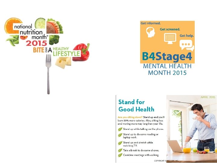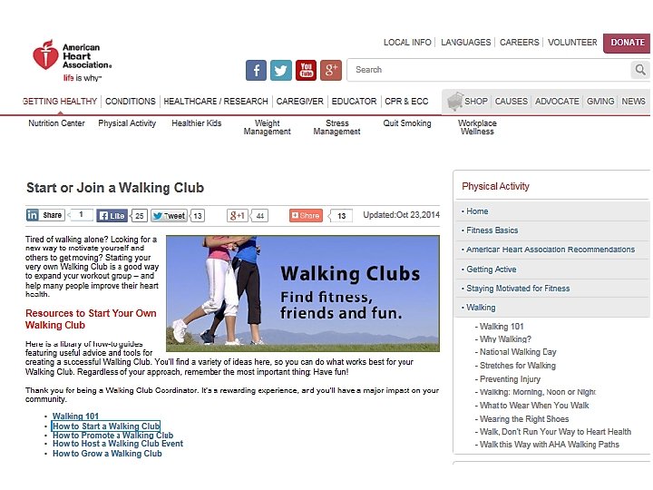 Healthy Eating - Weight Management • Salad Clubs • Healthy cooking demonstrations • Healthy recipe swap • Daily/weekly nutrition tips • Promotion of local farmers markets • Provide weight loss tools • Educational materials – Pay attention to portions – Fight food addiction – End emotional eating