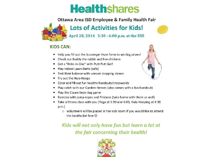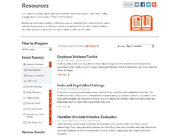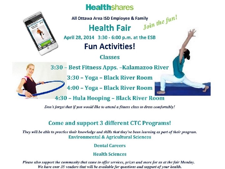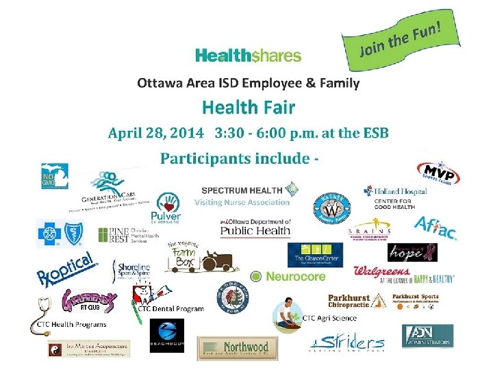 Awareness – Best Practices • • Staff Interest Surveys Health Risk Assessments Employee Health Fairs and risk seminars Announcements, posters, newsletters, “fitness library” – Share health and wellness information • Lunch n’ Learns • Website – house a calendar for events, gym discounts, fitness apps, etc. – http: //www. oaisd. org/oaisd/departments/humanresour ces/employeewellness/ • Social Media – https: //www. facebook. com/groups/healthshares