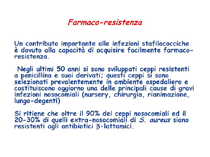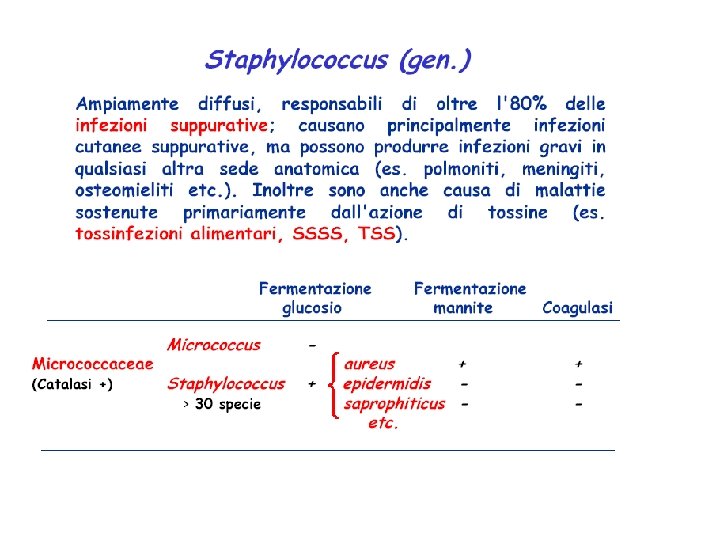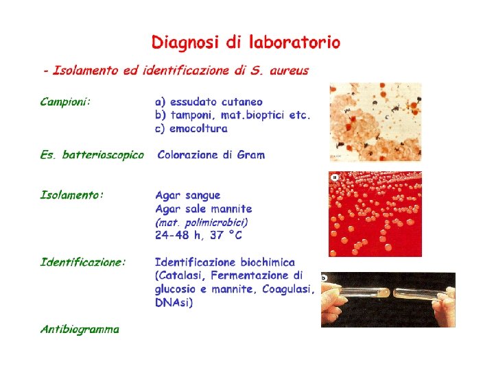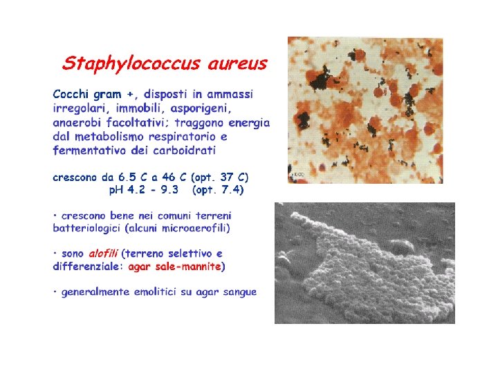 COLTIVAZIONE • Agar-sangue (le colonie di stafilococco appaiono circondate da un alone di emolisi) • Terreno di Chapman (7. 5% Na. Cl, mannitolo, rosso fenolo) (le colonie di S. aureus, ma non di S. epidermidis appaiono circondate da un alone giallo causato dal viraggio dell’indicatore per fermentazione del mannitolo)