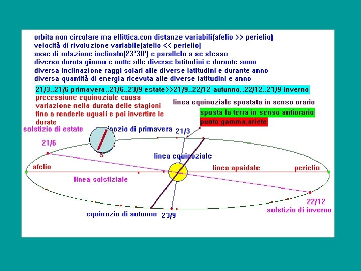 Invece l'orbita è ellittica, con variazione di distanza continua La velocità varia lungo l'orbita La inclinazione dell'asse e costante ma di 23° 30' La inclinazione dei raggi solari varia nel tempo e con la latitudine La durata del periodo di illuminazione varia con latitudine e tempo Inoltre, a causa del moto di precessione equinoziale, la posizione del punto gamma(dal quale inizia la primavera)e degli altri punti caratteristici(solstiziali, afelio, perielio)varia nel tempo: come conseguenza varia il periodo delle singole stagioni che diventerà uguale nei due emisferi e poi si invertirà attualmente il semestre primavera-estate prevale sul semestre autunno inverno nell'emisfero boreale (solstizio estivo in prossimità di afelio, bassa velocità) (solstizio invernale in prossimità di perielio, alta velocità)