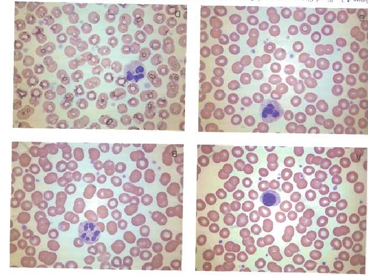 Romanowsky stain • Romanowsky stain→Eosin Y and Azure B) Eosin: Acidic Dye bind to Basic groups (Hb, Granules) → reddish or orange color Azure B: Dye bind to nucleic acid & nucleoproteins →Blue-violet color Fixation →Methanol<4%water, with 1 hour Delay : Adherence of Pro. To slide → Blue background