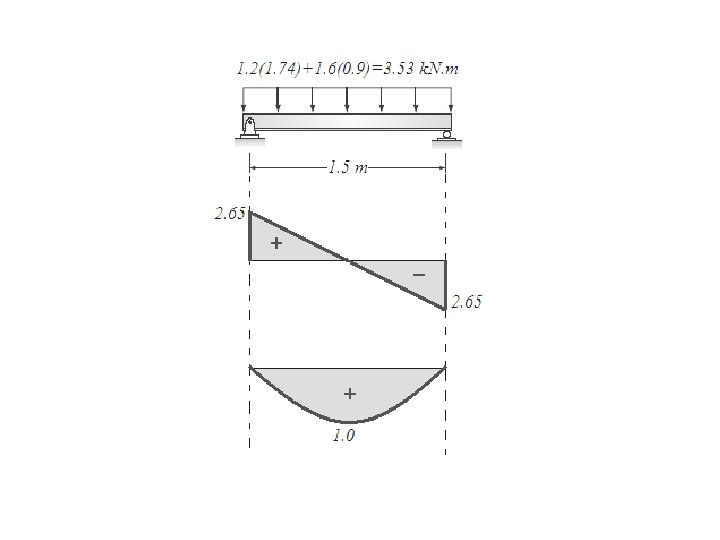 D. L(O. W) =0. 15*0. 075*25 + 0. 15*0. 075*25=0. 6 k. N/m D. L (covering material) = 0. 5 k. N/m D. L (total) = 1. 1 k. N/m L. L =3*(0. 3) =0. 9 k. N/m Wu = 1. 2(1. 1)+1. 6(0. 9) = 2. 76 k. N/m Vu = 2. 76(1. 5) = 4. 14 k. N Mu = Wu. L 2/2 = 3. 1 k. N. m 15 15 7. 5