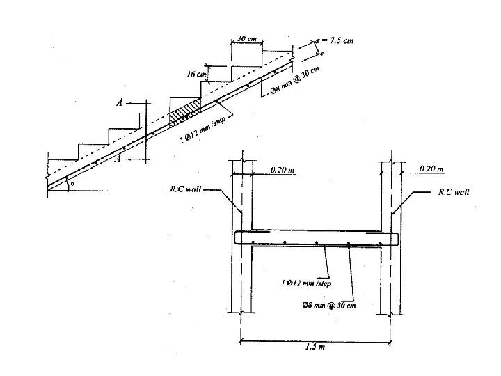 Simply supported stair Design a straight flight stair in a residential building supported on reinforced concrete wall 1. 5 m )(center to center) L. L = 3 k. N/m 2 Covering Material = 0. 5 k. N/m The riser are 16 cm and goings are 30 cm