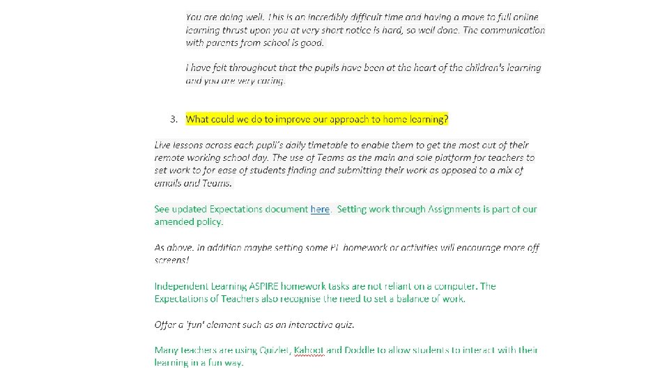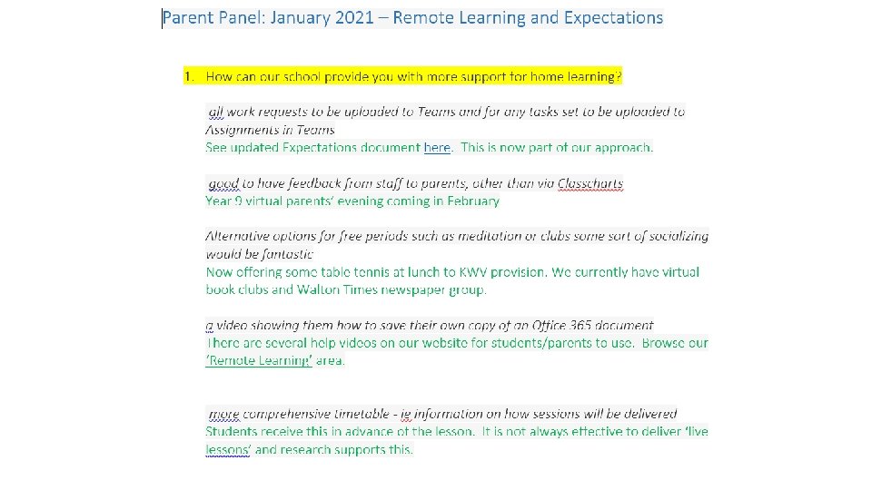 13 th January – Departmental Evaluations of Remote Learning so far Suggestions • Could we set with through Assignments for every lesson? Then store resources as usual in weekly folders in Teams? • Yes – now part of updated policy • Could we have a set opening screen for live lessons? • Yes – one has been circulated and is being used by some • Could period 1 start at 9 am rather than 8. 45? – Yes - amended • If there are three/four lessons a week, could at least one be live to allow students some contact with their teacher? • This is the case across most subjects. More frequently in many cases. • Could we clarify to parents/students the times when we will communicate with students? – Yes – part of remote learning policy • Feedback policies need to be amended to recognise potential workload issue with students returning lots of work (i. e. all acknowledged with a symbol at least; key pieces – identified by teachers – will be awarded more detailed feedback). Frequency and nature to be clarified. • SIG – w/c 25 th January – drafts to be finalised before half-term • Do we need to email work to students? They don’t seem to open emails. • • RLO –checked the data on email access. It is being used. We need to push. RLO to remind students in Year group Teams. Can we set up a dummy channel/Team to practice remote learning? • Use the ‘Remote Learning’ Team for this. Lots of staff already in there. Anyone is able to add another member of staff.