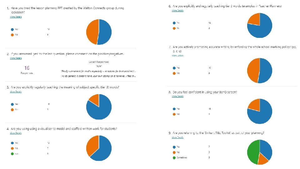 Moving Forward… • Embedding the ‘Teaching and Learning Policy’ and the Feedback-Plan. Teach philosophy. • Visualisers to improve extended writing (64% of staff currently using one) • Explicit instruction of vocabulary (79% of staff are currently doing this; moreso of the subject-specific vocabulary, rather than the tier 2 words). • Use of formative feedback to inform planning and teaching • Effective questioning – materials available for independent/departmental CPD • Promote independent reading using the Reciprocal Reading model (64% of staff currently using one) • Adapting to the shifting situation caused by the C-19 Pandemic. CPD to be offered where needed • Ensuring all students can access Teams and submit work …into Autumn 2
