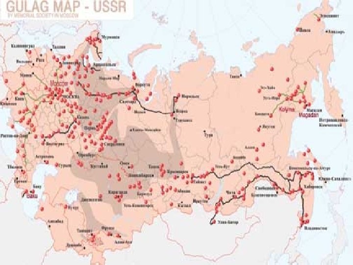 Gulags • Labor camps were to transform “criminals” into good citizens, although most would live a year or less • Men, women, and young children could all be sent to the Gulag for being petty thieves, homeless, shoddy work, being more than 20 minutes late, or breaking passport laws • Over 20 million were sent to the Gulags to work on canals, railroads, subways, architectural projects, and forestry • There was little food, torture, no machinery, in remote areas, rape and sexual abuse
