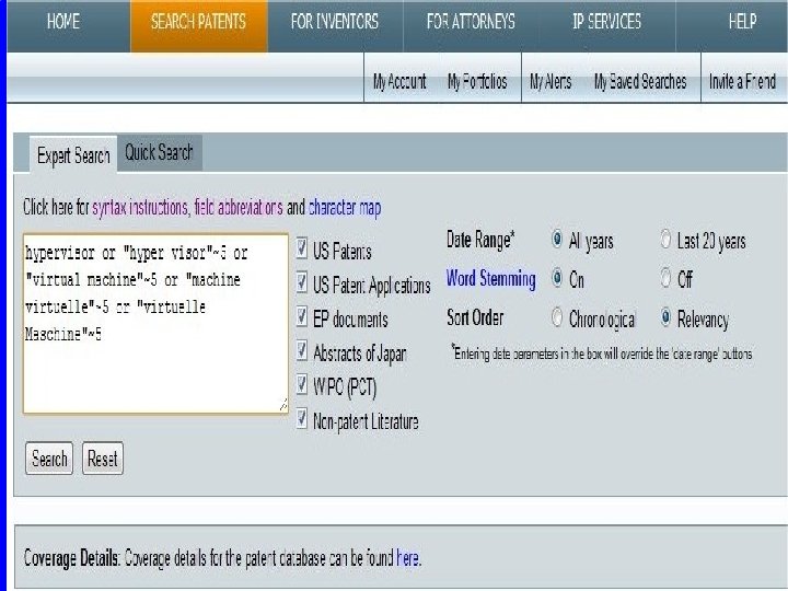 Considerations : l Allow nested consecutive proximity operators – ( ( silicon) w 6 (glass or ITO or titanium) ) ) W 6 (liquid w 2 crystal) ) AND (conduct w 6 transparent) – Not allowed in some commercial databases l Allow for stemming : conduct, conductive, conductor; silicon, silicone, etc. – Conduct*5, etc. l Allow bulk downloading of patents and apps