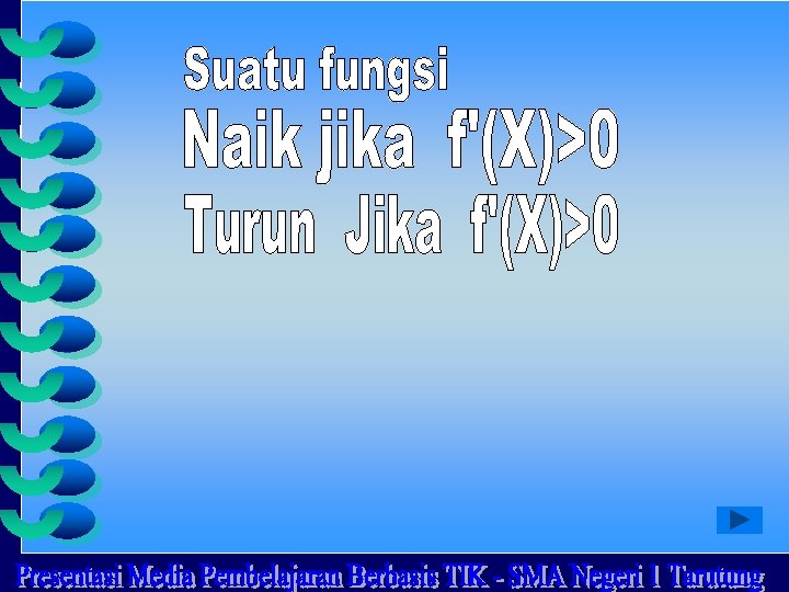 Contoh 2 Tentukan interval dimana fungsi a. Naik b. Turun Penyelesaian : Turunan pertamanya adalah a. Interval naik jika f’(x) >0 maka + -3 -1 Berdasarkan garis bilangan diatas, maka f a. Naik pada interval x<-3 atau x>1 b. Turun pada interval -3 < x < 1
