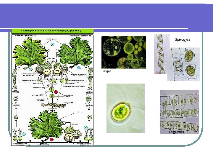 Ciri – ciri umum Tubuh berupa talus ( blm dapat dibedakan akar, batang, daun ) Uniseluler : soliter / koloni Multiseluler : filamen, lembaran, seperti tumbuhan tk tinggi Ada yg bergerak dg flagella Memiliki klooroplas Epifit ( menempel di tumbuhan, batuan , tanah ) Endofit ( hidup dalam tubuh makhluk hidup lain ) Reproduksi Vegetatif - pembelahan sel - Fraghmentasi - hormogonium sel tertutup lendir dan mati, filamen terputus membentuk benang baru Reproduksi generatif - konjugasi / isogami - anisogami - oogami