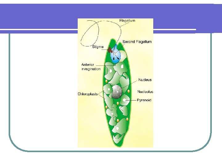 euglenophyta Mirip hewan : bergerak bebas, tanpa dinding sel, berbintik mata/stigma Mirip tumbuhan : berklorofil / berfotosintesis Habitat : air tawar Bentuk tubuh : oval panjang dg satu flagella di ujung mulut Pembelahan biner longitudinal