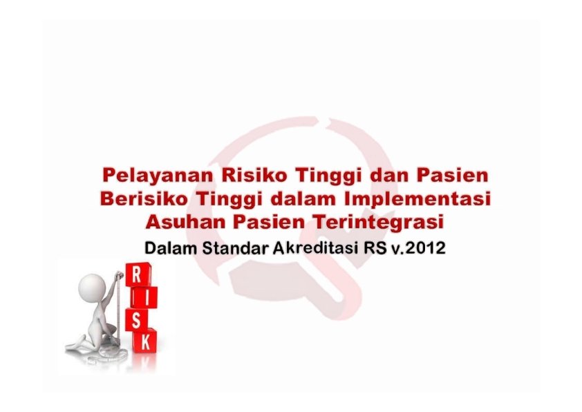 Pe la ya na n Be risiko St a nda r Ak re dit a si RS 2 0 1 2 Pa si e n ya ng be risiko t inggi 1. Ya n K a s u s Em e r g e n s i 2. Ya n Re s u s i t a s i 3. . Ya n Pa s i e n d g n Ve n t i l at o r & K o m a 4. . Ya n Pe n ya k i t Menular 5. . Ya n Pa s i e n I m u n o s u p r e s 6. Ya n Di a l i s 7. Ya n Pa s i e n Re s t r a i n e d 8. Ya n L a n s i a –A n a k – Berisiko Kekerasan 9. Ya n K e m o t e r a p i 1 0. Ya n Te r a p i l a i n y g berisiko Pe l a ya na n ya ng be risiko t inggi 1. . Ya n Tr a n s f u s i Da r a h / Pr o d u k Da r a h 2. . Ya n Pe n ya k i t M e n u l a r 3. Ya n Pe n ya k i t M e n u l a r 4. Ya n Di a l i s 5. . Ya n K e m o t e r a p i 6. . Ya n Te r a p i y g b e r i s i k o l a i n n ya